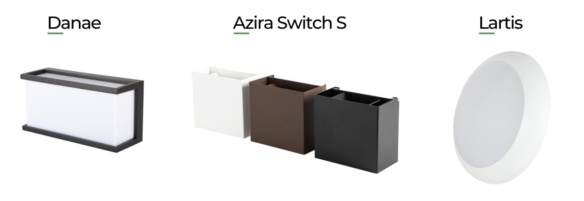 Crea ambientes acogedores con una estética limpia gracias a nuestra colección de apliques para entradas, porches y terrazas: Azira Switch y la nueva Azira Switch S, junto a Greco, Bayard / Bayard L, Niza, Sura, Deva Switch, Danae, Leida y Anvita. Modelos diseñados para exterior, con opciones de 3.000K y 4.000K y, en algunos casos, selector de temperatura de color para adaptar la luz a cada espacio.