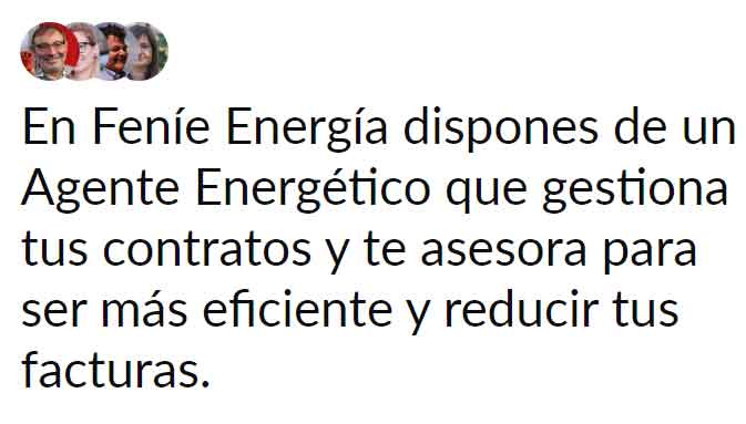 Fenie Energía es una empresa comercializadora, creada por miles de compañías instaladoras del país que ofrecen asesoramiento personalizado en eficiencia energética a través de sus Agentes Energéticos. Ofrecemos a nuestros clientes la contratación de electricidad, gas y productos de eficiencia, como el autoconsumo o la movilidad eléctrica, con el objetivo de que adopten hábitos de consumo que les ayuden a ahorrar energía y aprovecharla de forma eficiente.