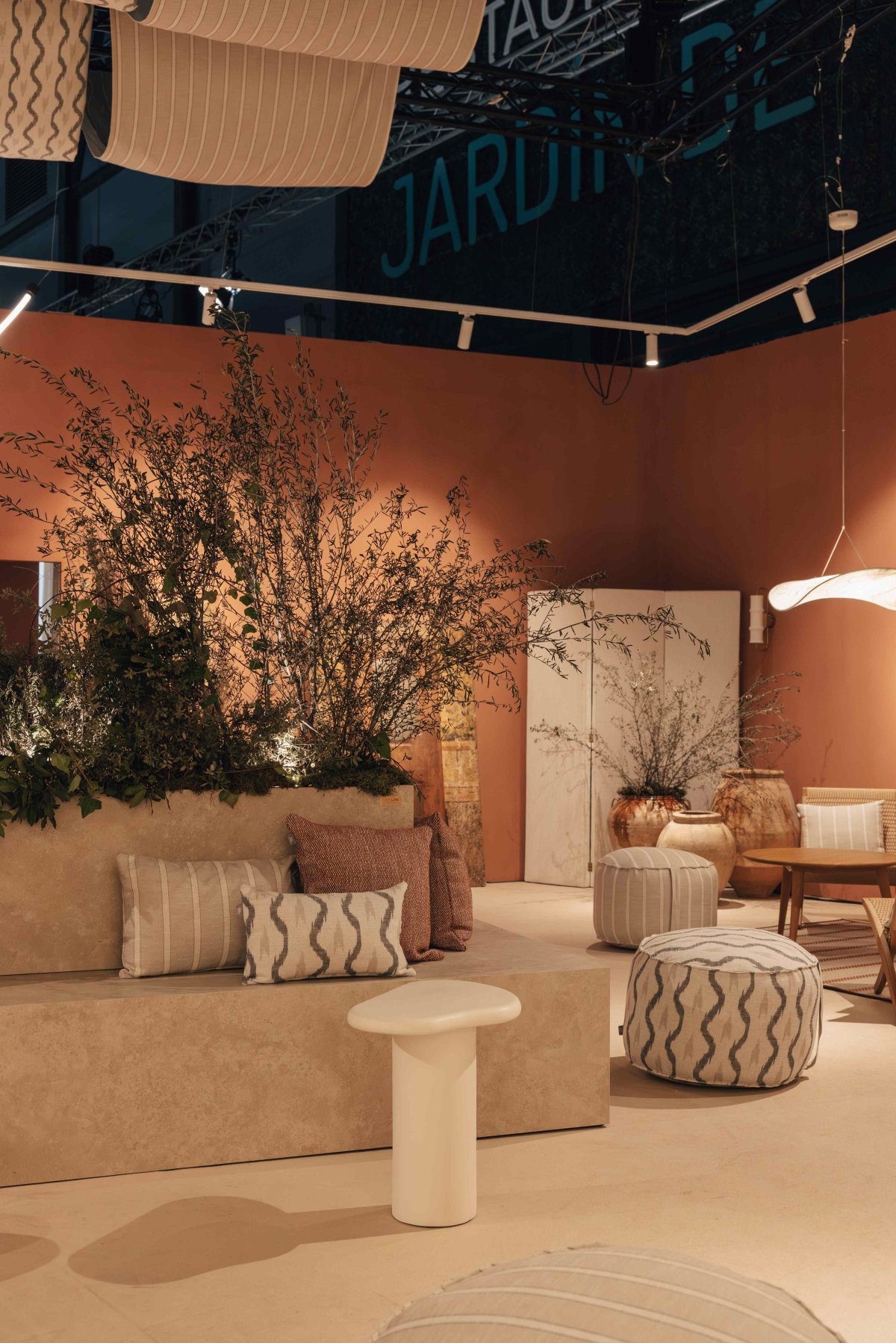 Concebida como un oasis dentro del recorrido ferial, la sala articula distintos ámbitos de pausa y encuentro. En este escenario, la iluminación desarrollada por Simon no se limita a resolver técnicamente el espacio, sino que construye escenas.