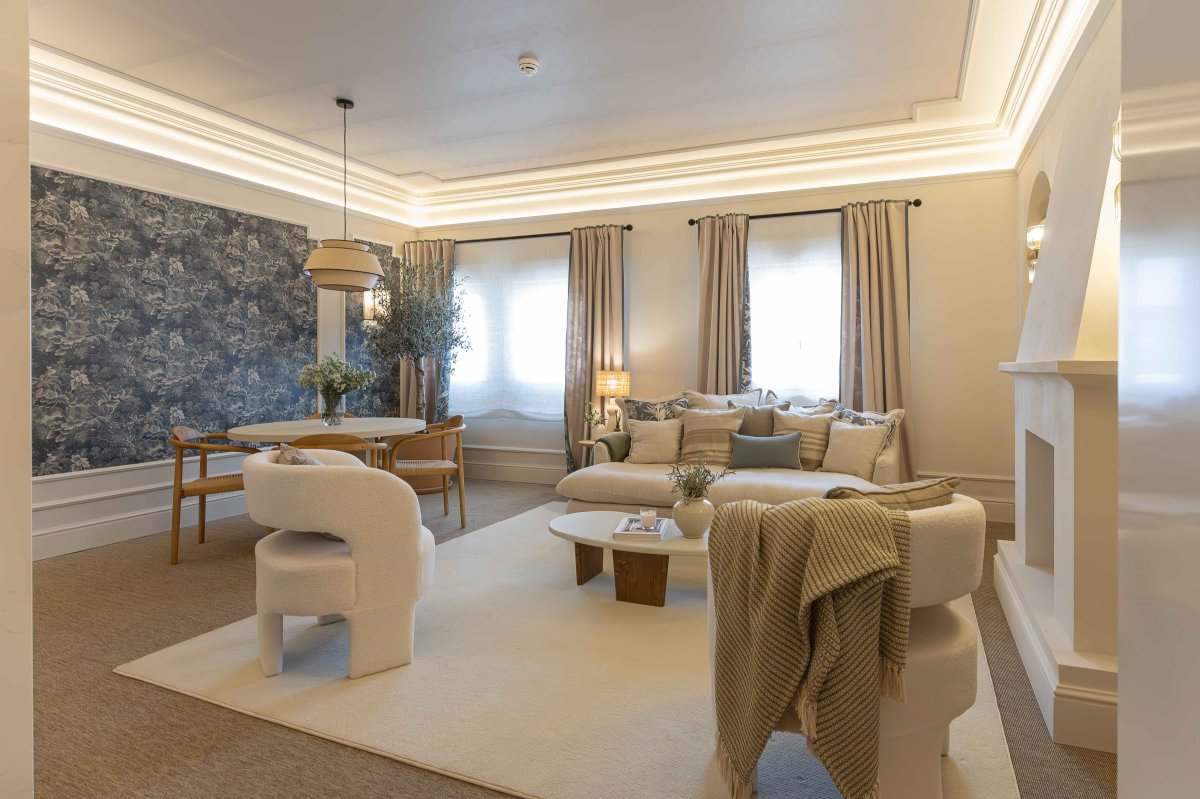 En el espacio de Leroy Merlin, Devesa &Agenjo proyectan un salón-comedor concebido como una invitación a habitar desde la calma y la permanencia. A través de un clasicismo renovado con acento mediterráneo, el espacio construye una atmósfera cálida y sensorial, donde Simon interviene con la iluminación y la integración de los mecanismos Simon 270.