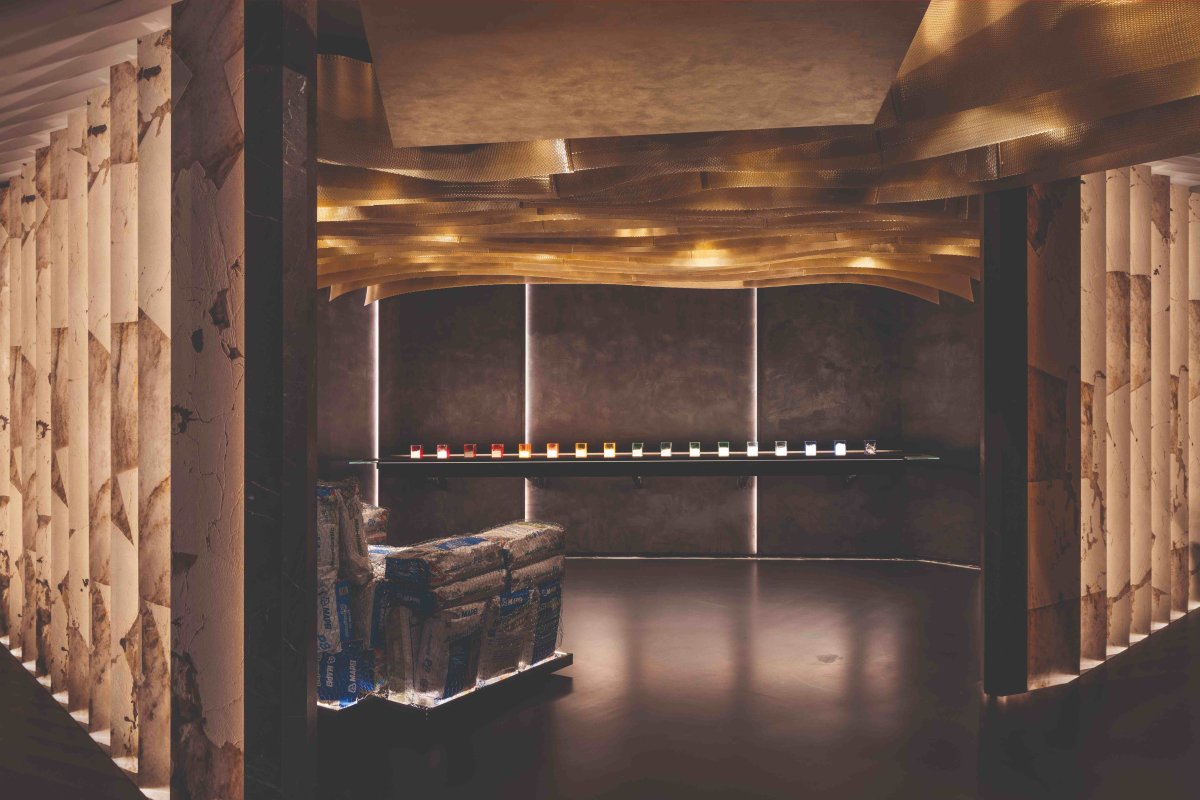 La propuesta de Cano y Escario Arquitectura para el espacio de Mapei se concibe como un entorno ingrávido definido por formas orgánicas suspendidas. En él, la contemplación se materializa a través de sacos de producto Mapei contenidos en mallas metálicas, configurando un elemento central en diagonal que representa la diversidad de acabados de la marca.En el extremo opuesto, un elemento lineal suspendido muestra materiales en polvo en su estado original, en una puesta en escena que remite a los procesos y a la sostenibilidad.